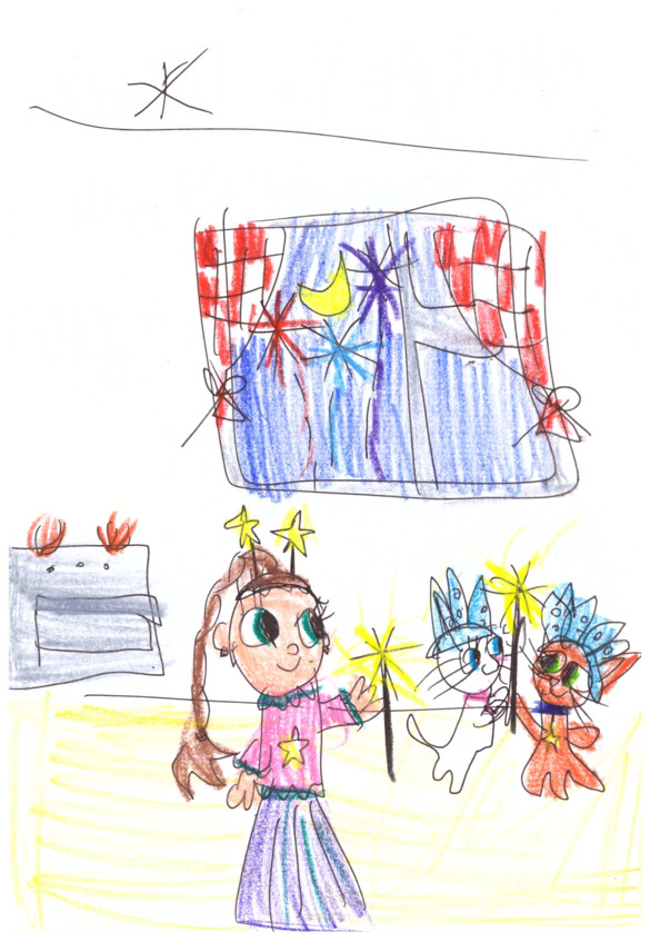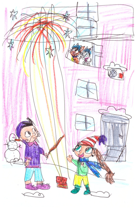 И тут загремели салюты за окном, и все начали их смотреть. Мия и родители зажгли бенгальские огни и начали смотреть салюты, а Пушка и Озри держали по бенгальскому огню, и из них вылетали искры – скры огня, а не магии!