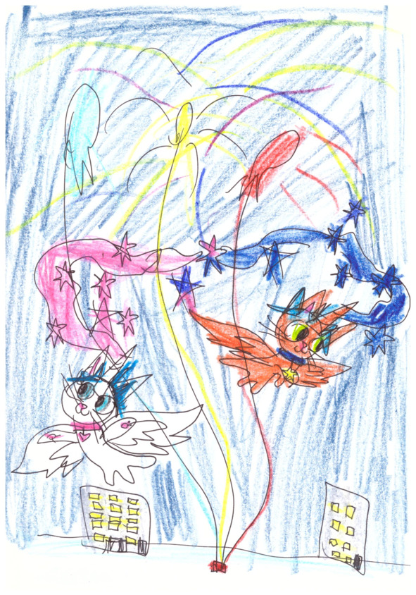 Когда все вернулись домой, Пушка и Озри стали котами-аликорнами и, когда никто не видел, вылетели в открытую форточку. Они летали под искрами салютов и добавляли свои искры магии.