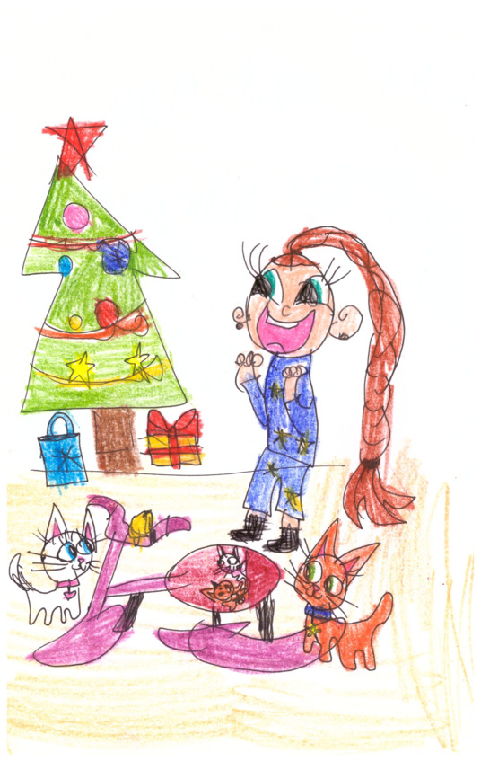 И Папа с мамой вручили Мии куклу, а Мия им открытки, которые сама нарисовала. Маме со снежинкой, а Папе с ёлочкой. Котятам она тоже вручила открытки – для Озри с шаром со снежинкой, а Пушке с дедом Морозом. Все благодарили друг друга за подарки. На завтрак котята съели новый фрискис, потом почистили зубы магией. Мия помыла миски Пушки и Озри и налила им свежей водички, котята попили. И вся семья собралась ехать к родственникам поздравлять их с новым годом.