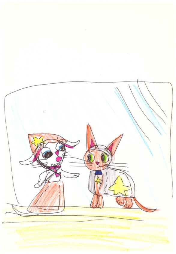 Мия согласилась помочь питомцам с нарядами. Она взяла два куска ткани и разрезала их на кусочки. Посшивала их иголкой как смогла, оставляя дырки для лап и головы. Наряды получились не очень красивые и не очень крутые. Котята примерили их, и Озри рассердился.