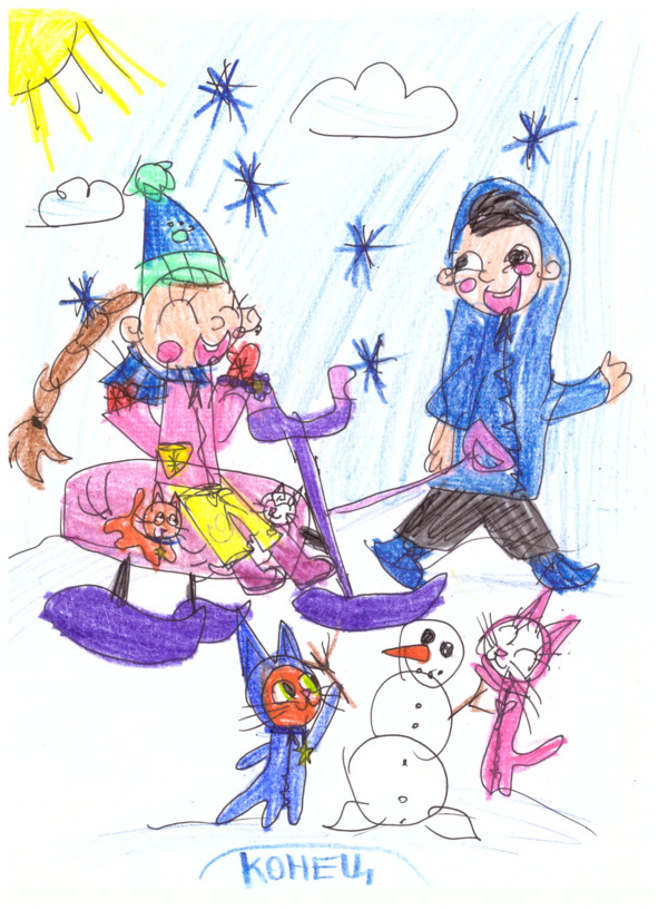 Ревела она два часа! А потом Пушка и Озри упросили Мию пойти гулять и испробовать новый снегокат. Всё-таки Мия согласилась, одела котят, взяла снегокат, и папа Мии пошел их катать на улицу. И у всех поднялось настроение. Пушка и Озри играли в снегу и лепили снеговика. И ещё скоро все поедут в путешествие! С новым годом всех!