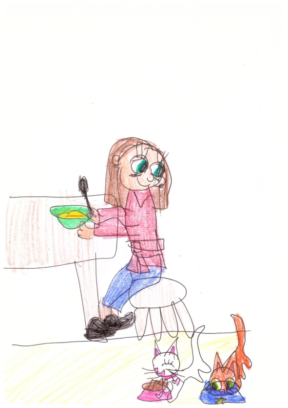 Котята прибежали на кухню. И принялись есть. Мия смотрела на котят, сонно улыбаясь и доедая манную кашу.