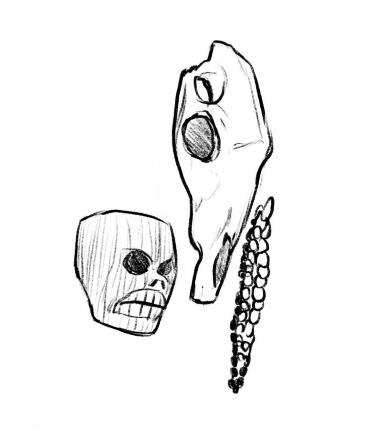 Комната Бабушки казалась не то окном в другой мир, не то пещерой Али-Бабы. Старая мебель здесь была завалена самыми разными предметами. Повсюду стояли черепа, бутылки с пиявками-кровопийцами, окаменелости с морских глубин и даже большое чучело бескрылой гагарки – странной птицы, которая вымерла много десятилетий назад и неизвестно какой волею судьбы оказалась в Бабушкином доме. На стенах висели маски разных племён, амулеты, предметы для обетов богам и в довершение всего хвост русалки и две тсантсы – прокипячённые и высушенные по древнему индейскому обычаю человеческие головы.