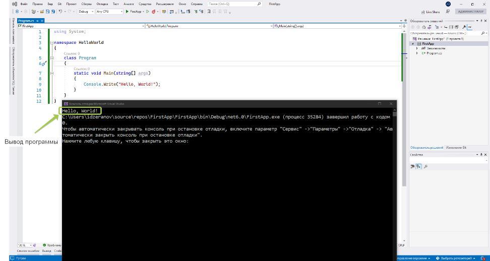 1. Обратите внимание, что каждая последующая команда Console.WriteLine() выводит указанный текст, начиная с новой строки.