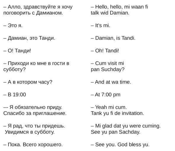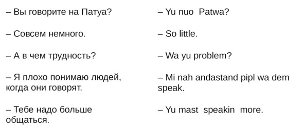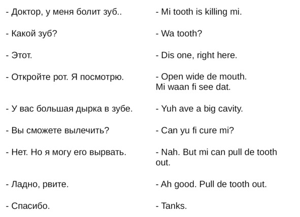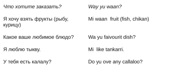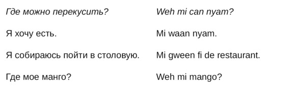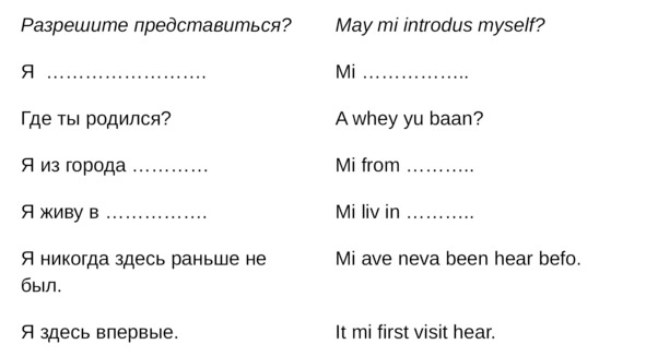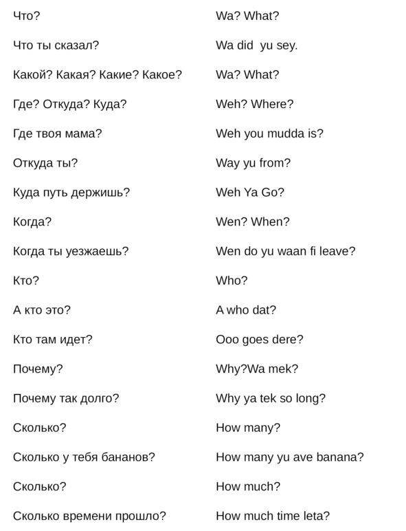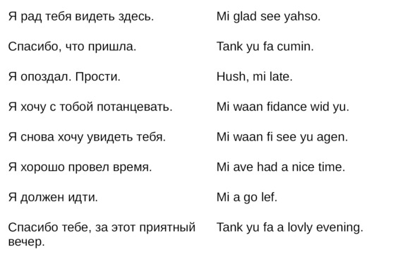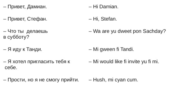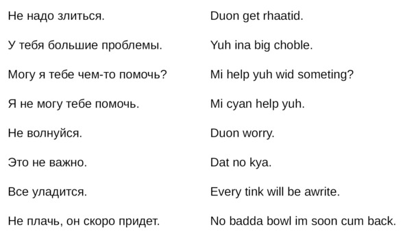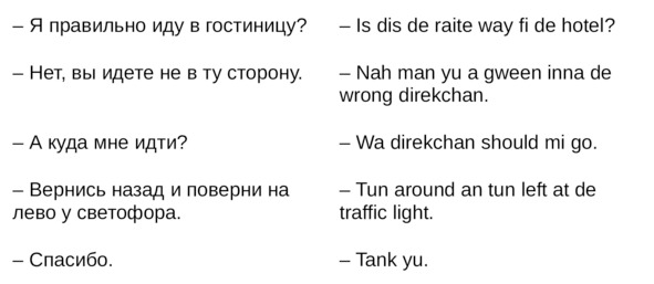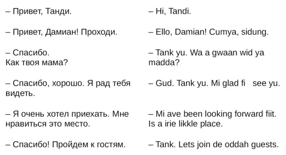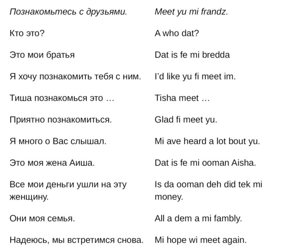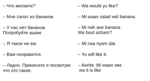 Jamaican Patwa произошел от английского, испанского, французского (и еще кучу разных языков). Не удивляйтесь знакомым английским словам. Школьные знания английского языка будут способствовать быстрому схватыванию материала.