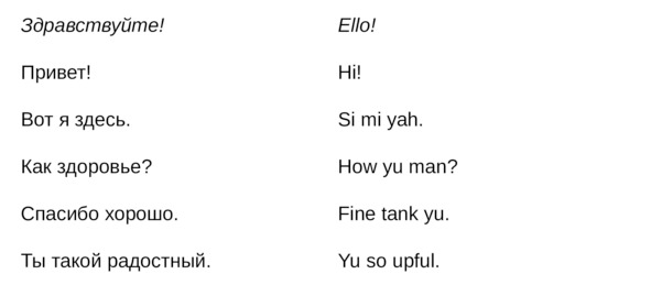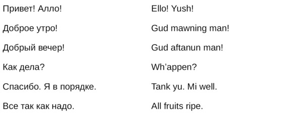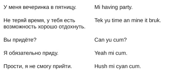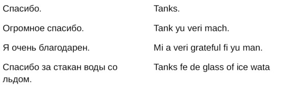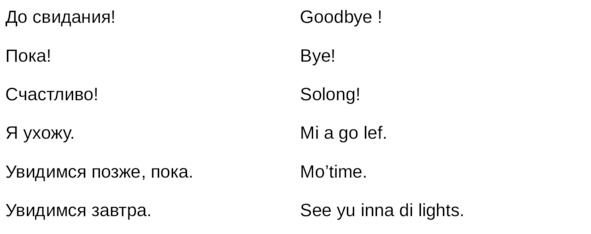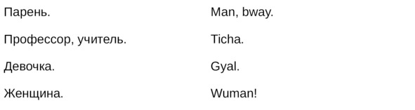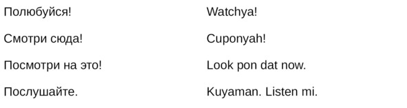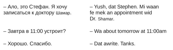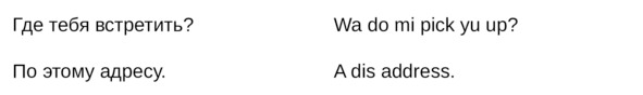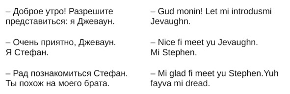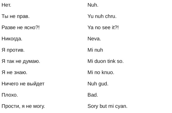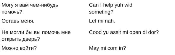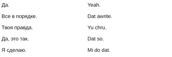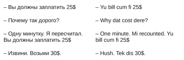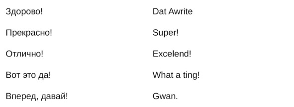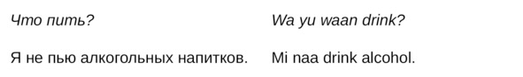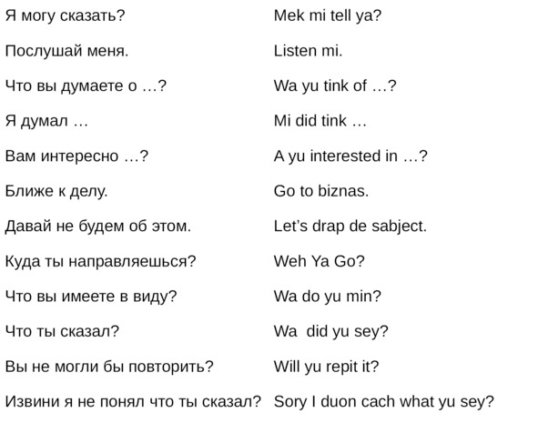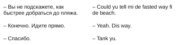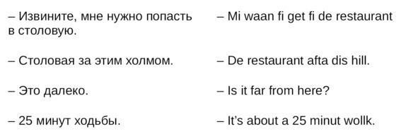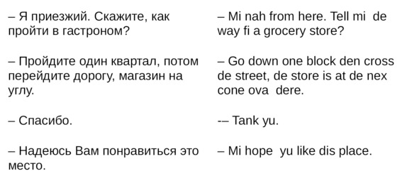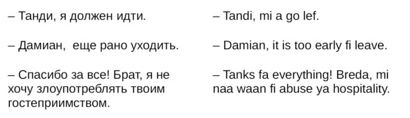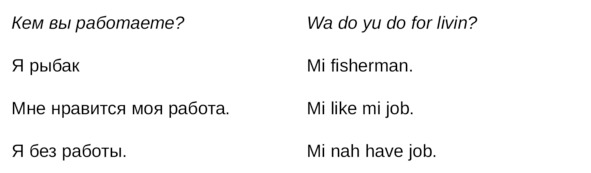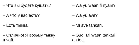 Jamaican Patwa произошел от английского, испанского, французского (и еще кучу разных языков). Не удивляйтесь знакомым английским словам. Школьные знания английского языка будут способствовать быстрому схватыванию материала.
