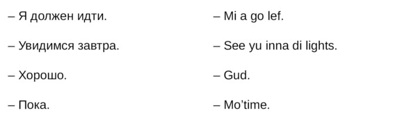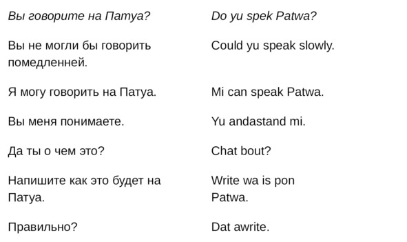 Jamaican Patwa не сформировался полностью как литературный язык, поэтому единые грамматические нормы как написания, так и произношения – отсутствуют.