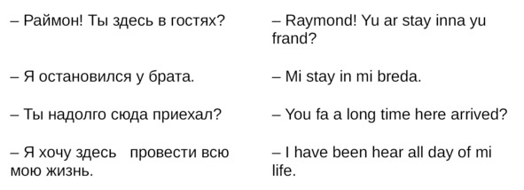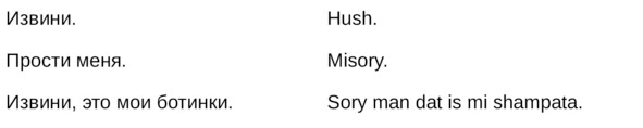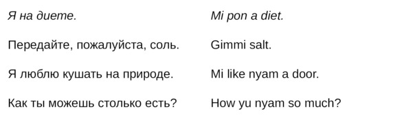 • Alligator lay egg, but ’im noh fowl —– крокодил тоже откладывает яйца, хоть он и не птица.