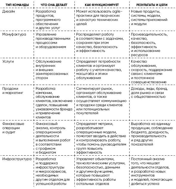 Обычно они делятся на несколько различных типов (см. таблицу 1.1). Как компании переходят от иерархий к командам? В Southwest Airlines летный экипаж – это команда, а пилот – ее лидер. Каждый экипаж несет ответственность и обладает полномочиями для обеспечения безопасности, соблюдения тайминга полетов и удовлетворения потребностей пассажиров. Такая структура не только улучшает показатели, но и способствует большей вовлеченности сотрудников. Southwest остается одной из самых прибыльных авиакомпаний, с рейтингом на платформе Glassdoor на 18 % выше, чем у конкурентов12. Ritz Carlton формирует команды вокруг каждого отеля. Генеральный менеджер руководит каждым объектом и распределяет сотрудников в команды по гостеприимству, сервисные команды, финансовые команды и другие. Компания гордится расширением прав и возможностей и обучением, известным своим девизом: «Мы дамы и господа, обслуживающие дам и господ». Подобный подход к командной работе обеспечивает одни из самых высоких уровней вовлеченности сотрудников и клиентов в индустрии13.