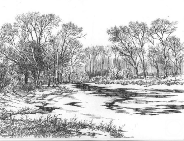 16Над замерзлай рэчкай сцелецца туман перад маразамі.