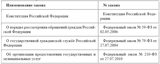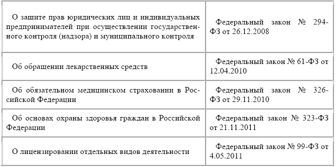 Ниже приведем перечень основных законов, применяемых в системе медицинского страхования и контроля за качеством медицинской помощи, табл.1.