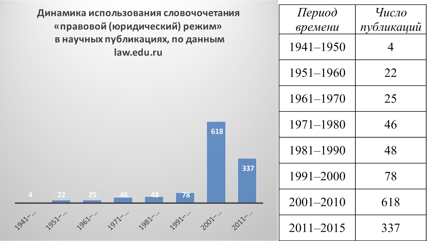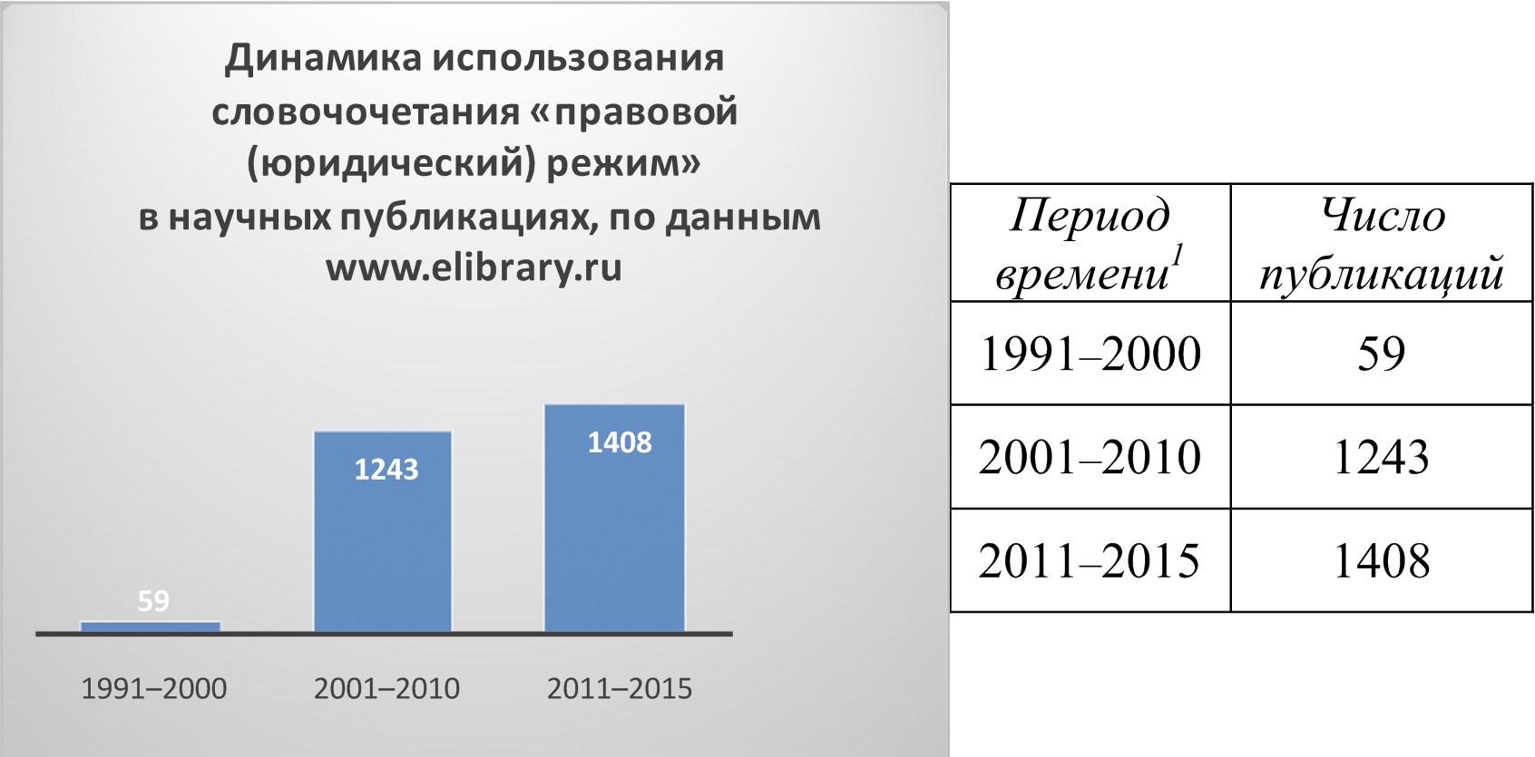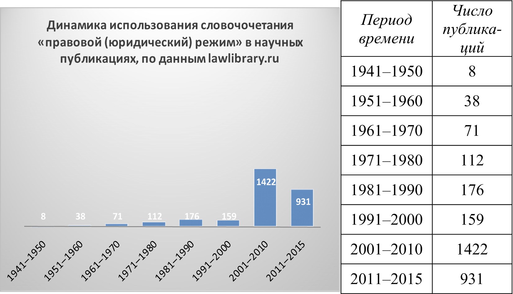 Интересно, что по данным каталога электронной научной библиотеки www.elibrary.ru за 2011–2015 гг. ученые написали уже больше статей, тезисов докладов, монографий и других научных материалов, чем за десятилетие с 2001 по 2010 г., а в первое десятилетие XXI в. было опубликовано в 21 раз больше «режимных» материалов, чем в последнее десятилетие XX в. Таким образом, и данные ресурса «Е-лайбрари» подтверждают резкий рост интереса правоведов к «режимному» наименованию своих публикаций.