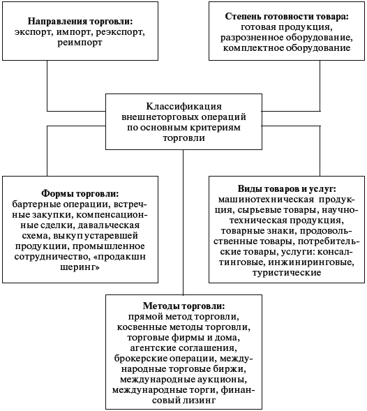 Современные внешнеторговые операции очень разнообразны. Поэтому не представляется возможным предложить один критерий, в соответствии с которым можно дать исчерпывающую классификацию внешнеторговых сделок. Все они должны рассматриваться с нескольких точек зрения: по направлениям торговли; видам товаров и услуг; степени готовности товаров; применяемым методам торговли; организационным формам торговли. На рис. 1.1 представлены внешнеторговые операции по перечисленным критериям классификации.