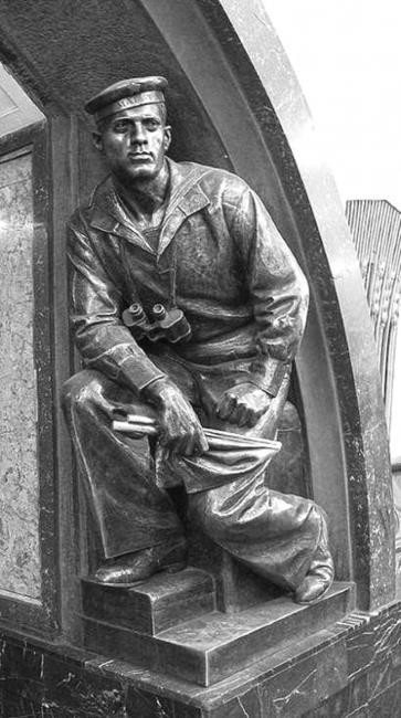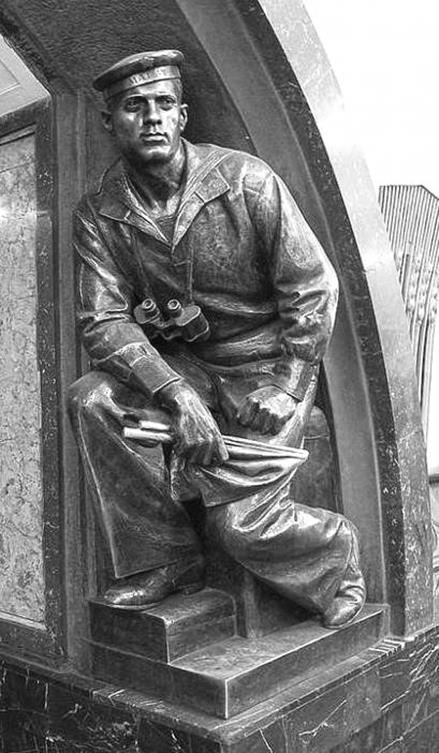 Здесь же, на линкоре, оказался и, уже известный в то время, скульптор Матвей Манизер. Долго присматривался скульптор к матросам и курсантам. Незаметить Олимпия было, просто, невозможно: и рост, и стать, и красивое русское лицо привлекли внимание скульптора. А искал художник подходящее лицо и фигуру для создания скульптуры матроса-сигнальщика, которая должна была украсить новую станцию «Площадь Революции», строящуюся в центре Москвы. И началась работа с Олимпием, разумеется, в свободное для курсанта время. Постепенно стал вырисовываться матрос в полный рост с сигнальными флажками в руке. Так и остался молодой курсант отлитым в бронзе навека. Да, повезло Олимпию, ещё ничего не совершив, оставить потомкам такую память о себе в скульптуре. Выбор скульптора оказался правильным и даже пророческим, как покажет время. Позже будут приведены народные приметы, связанные с этой и другой скульптурой на этой станции метро. А пока Олимпию повезло принять участие в таком значимом походе. Наверное, многое виденное на рейде и пригодилось будущему капитану 1 ранга через шестнадцать лет. Вернулись курсанты из похода, началась подготовка к выпускным государственным экзаменам. Учёба в те годы длилась четыре года. Этого было достаточно, чтобы подготовить офицера флота с высшим образованием. Выпускались тогда в основном вахтенными офицерами. Позже произошло чёткое разделение на факультеты: штурманский, артиллерийский и минно-торпедный. Все эти науки, разумеется, преподавались и в 30-е годы.