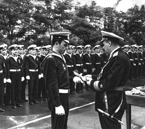 Первокурсники на параде выпускников торжества. Как раз тогда один год учёбы прибавили, зато к командным навыкам прилагались инженерные и соответствующий диплом. И это было неплохо, так как от туповатого генсека всего можно было ожидать: совсем недавно сократили вооружённые силы на один миллион восемьсот тысяч человек. Позже с гордостью, по радио, представляли передовиков производства: полковников – дояров или свинарей. Вот, чтобы с будущими офицерами так не поступили, решили прибавить ещё и инженерный диплом, ну и спасибо. Итак, гардемарины готовились получить дипломы, погоны, кортики и «поплавки» – значки о высшем образовании. О поплавках была такая байка: на нём далеко не уплывёшь, но и потонуть он тебе не даст. На форменках выпускников поблёскивал, любимый всеми моряками, значок «За дальний поход».
