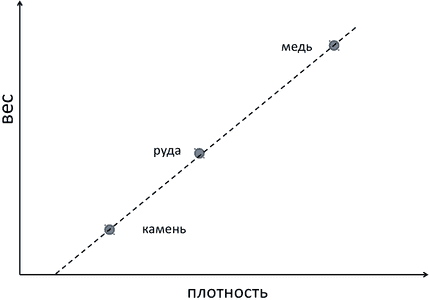 – Смотри, – сказал Часовщик, развернув свиток, – что получается. По этой оси – плотность шаров одного размера, вычисленная по моменту инерции, по этой – вес. Видишь противоречие? Тут есть система: все три шара – гранит, руда и медь – легли на одну прямую линию. Но это довольно странная прямая. Получается, что вес не пропорционален количеству вещества. Надо проверить зависимость – у тебя есть какой-либо материал тяжелее меди?