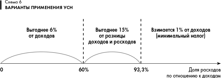 Если же избрать объектом налогообложения разницу доходов и расходов, то появляется закономерность: чем больше расходы, тем меньше величина подлежащего уплате налога по УСН. Однако здесь есть пределы налогового планирования. Государство обеспечило себе несгораемую сумму поступающего от УСН налога в размере 1% от всех доходов (т. е. без учета расходов) – так называемый минимальный налог, взимаемый в связи с применением УСН. Если заявленные расходы налогоплательщика настолько велики, что исчисленный налог по УСН составил менее 1% от всех доходов (т. е. без учета расходов), то уплате подлежит именно минимальный налог, т. е. 1% от доходов (п. 6 ст. 346.18 НК РФ).