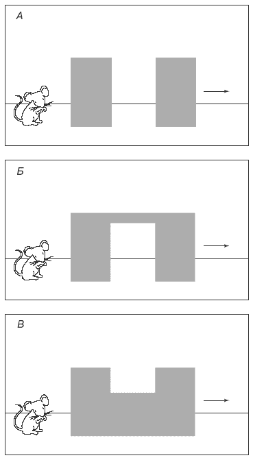1. Детям в возрасте 2,5 месяца демонстрировались три ситуации, в которых игрушечная мышка перемещалась в направлении слева направо за преградами (рис. 6). Если в первых двух случаях игрушка должна быть видна после прохождения первого экрана, то в третьем ее не было видно. Тем не менее эксперимент был устроен так, что мышка после того, как она заходила за первый экран, появлялась сразу из-за второго экрана. Оказалось, что при такой организации исследования младенцы значительно дольше смотрят на экраны в первой ситуации, чем во второй и в третьей. С точки зрения Р. Байларгеон, это говорит о том, что «младенцы (В) верили в то, что мышка продолжает существовать после того, как она исчезла из виду; (Б) понимали, что мышка не может исчезнуть и появиться из-за другого экрана без прохождения расстояния между ними; и (А) ожидали, что мышка появится между экранами, и были удивлены, когда она этого не сделала»[13]. В то же время, когда экраны были соединены перегородкой, то они воспринимались младенцами как единый экран, за которым игрушку не должно быть видно. Уже в 3 месяца дети ожидают появление игрушки в случае, когда экраны соединены верхней перегородкой, а в 3,5 – когда они соединены нижней перегородкой. При этом уже в 3,5 месяца дети начинают соотносить размер объекта и размер заграждения: они ожидают, что при прохождении низкого заграждения высокий объект будет виден, и наоборот.