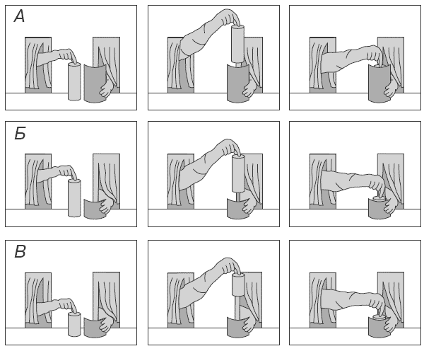 В – контрольный эксперимент: короткий объект цилиндрической формы опускается за низкую перегородку.
