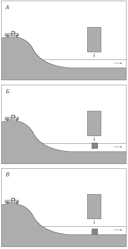 3. В эксперименте с 6-месячными младенцами детям демонстрировалась горка, переходившая в ровный горизонтальный отрезок поверхности, посередине которого располагался экран (рис. 8). Экран опускался, и с горки спускалась игрушечная машинка в направлении экрана, проезжала за экраном, выезжала из-за него и останавливалась в конце отрезка. Результаты показали, что именно в последнем случае (В) младенцы значительно больше времени смотрели на экран. Другими словами, они были удивлены, что машинка проехала за экраном в то время, когда коробка находилась на ее пути.