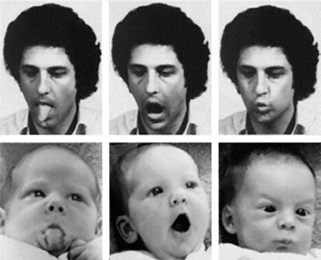 Эти данные побудили огромное количество исследований в самых разных странах на младенцах различных национальностей, но их итог однозначно говорил в пользу обнаруженного феномена. Так, например, в работе Т. Фиелд и ее коллег 74 младенцам в возрасте 1,5 дня взрослый демонстрировал радостное, грустное и удивленное выражение лица. Основываясь на движениях бровей, глаз, рта независимые наблюдатели, которые следили только за выражением лица младенца (а не взрослого), в 70 % случаев смогли определить то выражение лица, которое копировал ребенок. «Эти результаты предполагают, что новорожденные дети способны различать по крайней мере три различных выражения лица»[17]. Также в исследованиях М. Легерсти было убедительно показано, что подобные реакции (такие, как открывание рта, высовывание языка и др.) младенцы демонстрируют в ответ на социальные стимулы, но не на действие неживых объектов[18]. Например, в случае открывания и закрывания специальной коробки (что имитировало открывание и закрывание рта человека), младенцы усиливали движения языка так, как будто собирались исследовать объект; когда младенцу предъявлялся объект, приближавшийся к его лицу и имитировавший высовывание языка, ребенок открывал рот так, как будто видел перед собой бутылку. Это исследование еще раз подчеркивает правомерность предположения, согласно которому младенец имплицитно «знает» о существовании другого человека и возможности взаимодействия с ним.