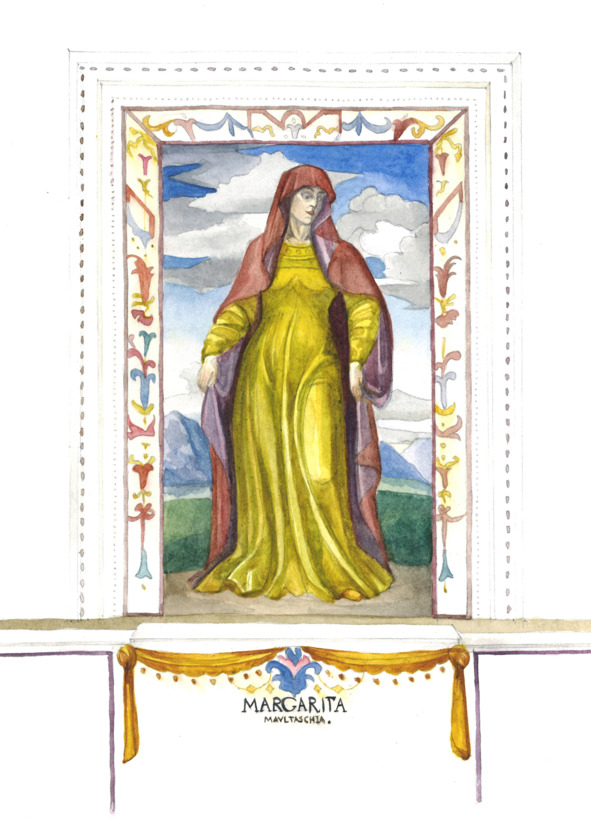 In the Spanish Hall of Ambras Castle in Innsbruck, among portraits of Tyrolean rulers, you can see a full-length picture of Margaret, portrayed against the background of nature. The Countess of Tyrol looks rather attractive in this picture of mid-16 century. This slender, tall woman with harmonious facial features and her eyes modestly cast down cannot be called ugly. Margaret appears as the same attractive woman in the album of engravings of late 16th century. The author of the album, the Flemish painter and engraver Dominique Kustos, who served at the court of Emperor Rudolf II in Prague, depicts Countess of Tyrol among 28 Counts of Tyrol, from Albert IV (1190—1253) to Rudolf II (1552—1612). In the engraving by Kustos, Margaret looks obviously similar to the portrait from the Ambras Castle Spanish Hall, though the countess’s lower lip seems intentionally exaggerated. Most likely, the artist wanted to emphasize the connection of the nickname Maultasch with one of the meanings of this word – “big-mouthed”. However, even with the disproportionally big lower lip, Margaret doesn’t look unattractive in Kustos’s engraving. th Tirolensium Principum Comitum