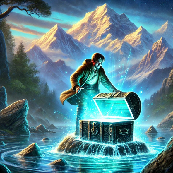 Taking a deep breath, he plunged into the water. It was crystal clear, revealing the depths below. As he opened his eyes, he saw something resting on the lakebed – a small chest, glowing with a bright, ethereal blue light.