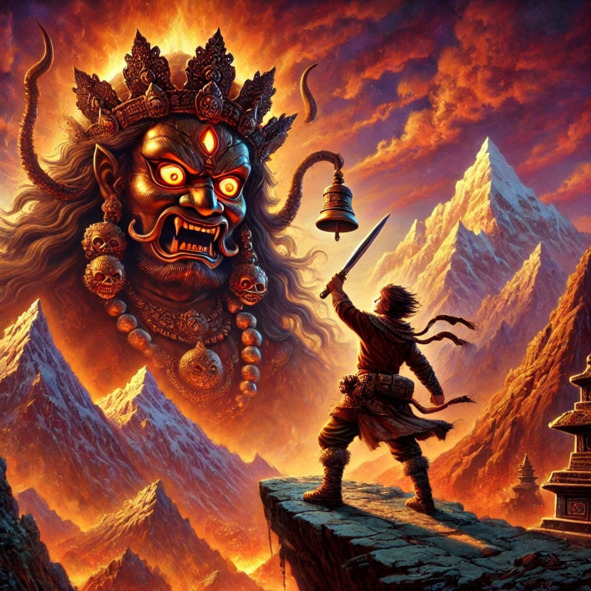 At that very moment, the sky and mountains turned orange and crimson. It grew so hot that it was as if a fire had been lit beneath Dordje’s feet. The brave young man endured it, holding the bell before him and using the dagger to cut away the tongues of flame that Mahakala, the fiery beast, sent his way. The giant appeared in all his terrifying glory – his head as large as a mountain, eyes like two flaming orbs, with a third eye burning on his forehead. His crown was adorned with human skulls, and flames burst from his mouth.