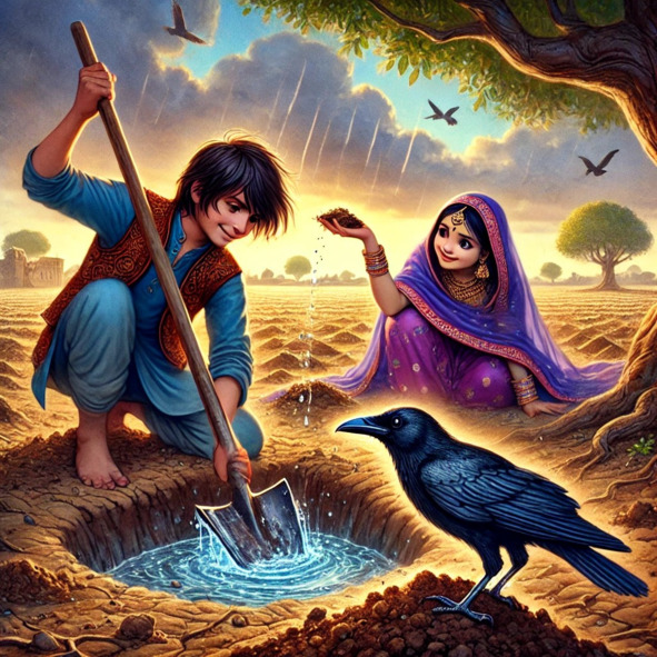 “Look,” Sadhir exclaimed. “That raven is pecking at the ground and scratching it like a hen. It must sense water nearby!”