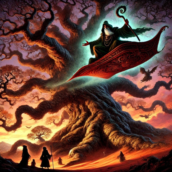Karidur spotted a mighty oak, taller than any other, its massive branches reaching the sky, its roots twisting like serpents above the ground. He landed upon the very top of the tree, hidden within its thick canopy, unseen from below. Resting for an hour, he then transformed – under the bright morning sun – into a stooped old traveler, appearing as if he had come from far away, weary from his journey. He sat upon a stone to rest, sipped some water, and gazed at the city as if admiring it.