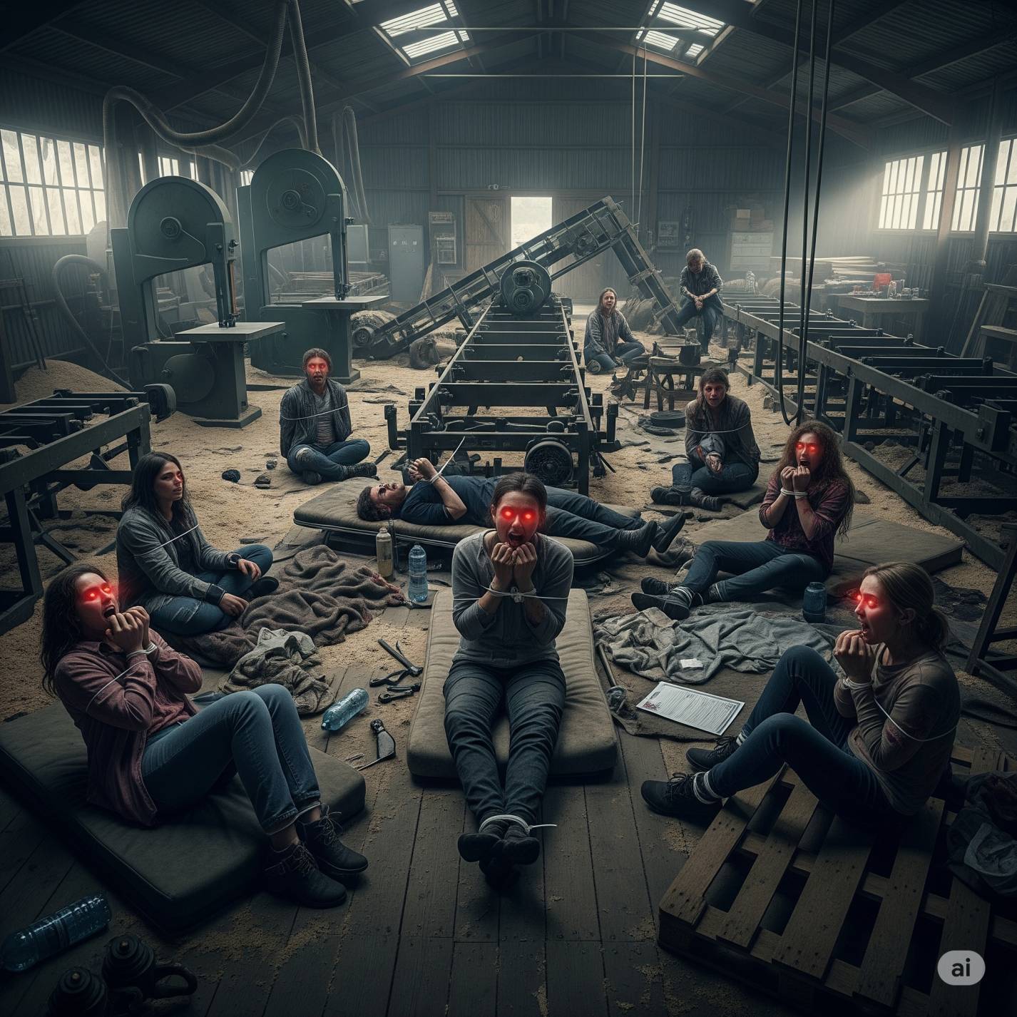 Пришлось разворачиваться и топать за мастером. Авторитет – это всё – таки сила. Раненных собрали в большом цехе лесопилки, наручников на всех не хватило, поэтому использовали пластмассовые стяжки. Просто, но эффективно. Зараженные пробовали их грызть, но пока безрезультатно. Лежали и сидели они кто на матрасах, кто на старых телогрейках или тряпье. Весь цех напоминал декорации к съемкам фильма про зомби.