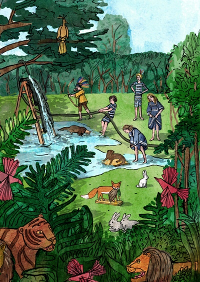 Добавление. Я не упомянул и половины того, что мы смастерили для джунглей, например, зверей из набитых конским волосом диванных подушек, слоновьих бивней и дядиных рыбацких сапог.