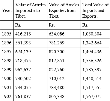 The only exports to the value of £1,000 are musk, ponies, skins, wool, and yaks'-tails.