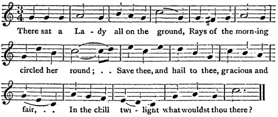 There sat a Lady all on the ground,Rays of the morning circled her round;Save thee, and hail to thee, gracious and fair,In the chill twilight what wouldst thou there?