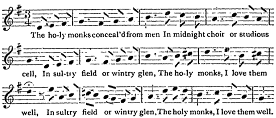 The holy monks conceal'd from menIn midnight choir or studious cell,In sultry field or wintry glen,The holy monks, I love them well,In sultry field or wintry glen,The holy monks, I love them well.