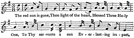 The red sun is gone,Thou light of the heart,Blessed Three Holy One,To Thy servants a sunEverlasting impart.