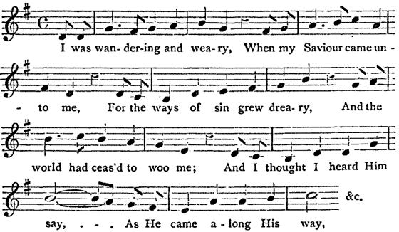 I was wandering and weary,When my Saviour came unto me,For the ways of sin grew dreary,And the world had ceas'd to woo me;And I thought I heard Him say,As He came along His way, &c.
