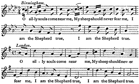 BirminghamO silly souls come near me,My sheep should never fear me,I am the Shepherd true,I am the Shepherd true.LondonO silly souls come near me,My sheep should never fear me,I am the Shepherd true,I am the Shepherd true.