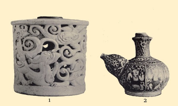 There are also certain forms made chiefly, but not exclusively, for the Mohammedan west. Of these, we may mention the bases for the hookah, recognisable by the small, straight spouts at the side to which the flexible smoking-tube is attached; the scent-sprinklers with tall, narrow necks; and the hand-spittoons with globular body and wide-spreading orifice,—these last, by the way, are used in China also.