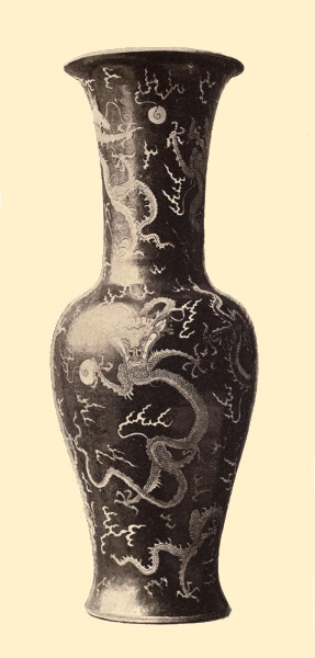The Empress-Dowager, who has held the reins during the minority both of Tung-chi and of his successor, the present emperor, is reputed to be something of a connoisseur,71 and to take an interest in the imperial manufactory. Some of the better class wares from the palace and from the temples at Pekin have quite lately found their way to England, and specimens may be seen on loan at South Kensington. I notice especially a set of five vessels in deep blue from the Temple of Heaven. The execution appears to be careful, but the forms are ugly and the blue of an unpleasant tint. In vessels of this kind, however, both shape and colour may be governed by tradition. Mr. Hippisley, who has lived long in China, says that for some years past the famille verte wares of Kang-he’s time, especially the vases with black ground and prunus flowers, have been fairly well reproduced at King-te-chen, as have, later still, the so-called ‘hawthorn ginger-jars.’ But in China, as in France, it is with the difficulties of the copper glazes, the flambé and the sang de bœuf, that the majority of our contemporary ceramic artists are striving.
