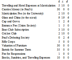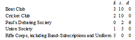 The captain of the Paul’s company in the Rifle Corps had come to work upon his military ardour; the president of the College Debating Society, to arouse his ambition for oratory; the collector for the various Church Societies, to test his impartiality and charity. Frank was enabled, by his father’s wish and the means he had placed at his disposal, to join the various societies, and pay the subscriptions. But it was not this pecuniary willingness alone that gained for our freshman so much popularity. The pecuniary outlay was as follows:—