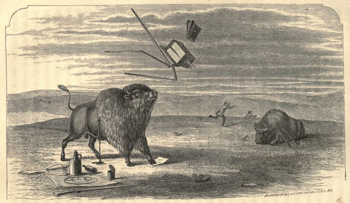 Fortunately for the artist, the blow originally intended for him was delivered upon the legs of the instrument. His assailant being at length dispatched, the poor fellow proceeded to pick out of the ruins of his property what remained that might again be useful. He stated that his stock, as well as the subject of buffalo photographing, was "rather mixed," and that, if we would pay him for the damage done, he would return. Next morning he left us, and thus it was that science lost the projected series of valuable photographic views.