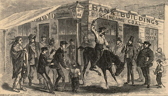 That horse-auction was a sight worth seeing. The crowd collected most thickly on the corner of Kansas Avenue and Sixth Street, and before it the cob came to a stand. And it was a stand—as stiff and painful as that of a retired veteran put on dress parade. The limbs would have had full duty to perform in supporting the carcass alone, which had evidently been in light marching order for years past. The additional weight of the auctioneer must certainly have proved altogether too much, had not the horse heard, for the first time, of the wonderful qualities with which he was still endowed.