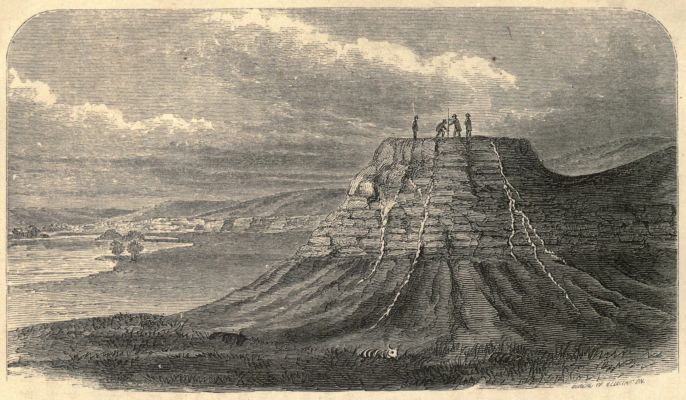 During the day we found and secured the remains of two saurians—one about eight and the other ten feet in length, and also the tooth of a fossil horse, quite a number of curious bubble-shaped pieces of iron pyrites, and some fine petrifactions, in the way of butternuts and fragments of trees. The soft, white limestone, mentioned more than once before in this record of our expedition, appeared along our paths in fine outcrops, and contained very perfect fossil shells.