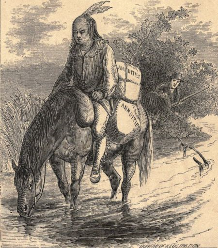 "The Indians of Kansas are divided into the wild and the tame. Both alike cover their nakedness with bright handkerchiefs, old shirts, military coats, and many-hued ribbons. The principal difference in point of dress is in the method of procuring it. Among those tribes which are at peace with the government, the white man robs the Indian; among the wild tribes the conditions are reversed—the Indian robs the white man. In the one case the contractors and agents carry off their half million dollars or thereabouts; in the other the savage bears away a quantity of old clothes and fresh scalps. As he finds it difficult to procure sufficient of the white man's justice to satisfy the cravings of his nature, he feeds it with what he can and whenever he can of revenge. Wise men tell us, gentlemen, that revenge is sweet and justice a dry morsel. All Indians beg when they get an opportunity. The tame ones, if they find it fruitless, divert themselves by selling worthless pieces of wood with strings attached, as bows. The wild ones, in a like predicament, relieve their tedium by whacking away at our ribs with bows that amount to something. The principles actuating both classes are alike. It is simply the application which causes difficulty—in the one case an appeal with bow and arrows to our pockets, in the other to our bodies.