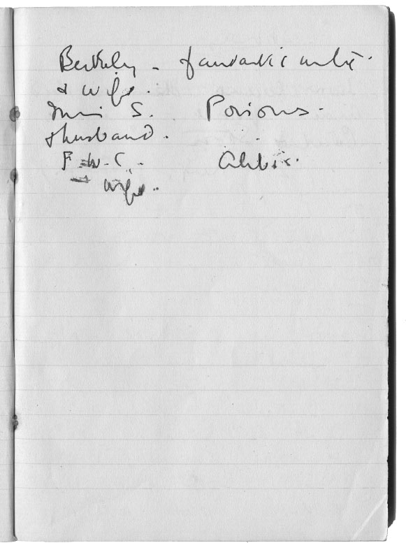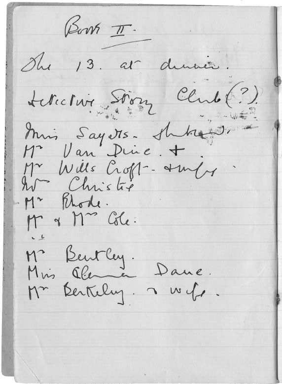 At the same time, Christie contemplated writing a novel set around a ‘Detective Story Club’ involving ‘13 at Dinner’. In one of her private notebooks, she listed the cast of characters. Sayers and her husband are included, alongside a mention of ‘Poisons’, as are Freeman Wills Crofts and his wife (‘Alibis’), Christie herself, John Rhode, Edmund Bentley, Douglas and Margaret Cole, and Clemence Dane. Anthony Berkeley (and his wife, which suggests the couple contrived to keep their matrimonial difficulties to themselves) also appeared on the list.