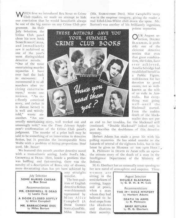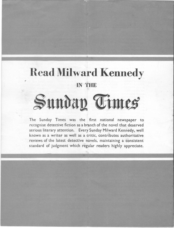 The Crime Club News’ back page advertisement for Milward Kennedy’s reviews in the Sunday Times.