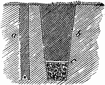 It will be seen that the tile drain is made with much less labor than the stone drain, as it requires less digging, while the breaking up of the stone for the stone drain will be nearly, or quite as expensive as the tiles. Drains made with large stones are not nearly so good as with small ones, because they are more liable to be choked up by animals working in them.34