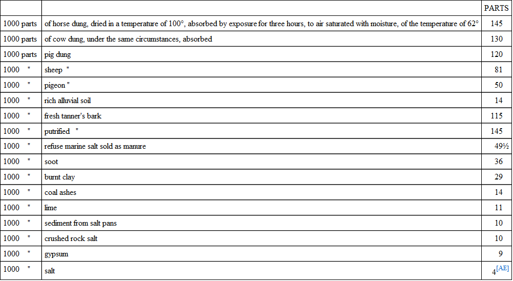 ABSORPTION OF MOISTUREIt is often convenient to know the relative power of different manures to absorb moisture from the atmosphere, especially when we wish to manure lands that suffer from drought. The following results are given by C. W. Johnson, in his essay on salt, (pp. 8 and 19). In these experiments the animal manures were employed without any admixture of straw.