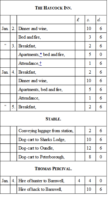 Fox-hunting is a costly luxury if one goes well mounted and well appointed. It can hardly be made cheap, even when one lives in his own house and rides his own horses. With hotel bills and horse-hire, it costs still more. As an occasional indulgence it is always a good investment. My own score at the Haycock was as follows,—by way of illustration, and because actual figures are worth more than estimates. (I was there from Thursday afternoon until Sunday morning, went out with a shooting-party on Friday, dined out on Friday night, and hunted on Saturday.)